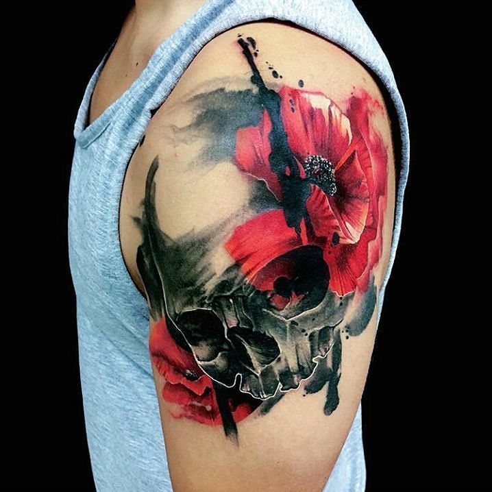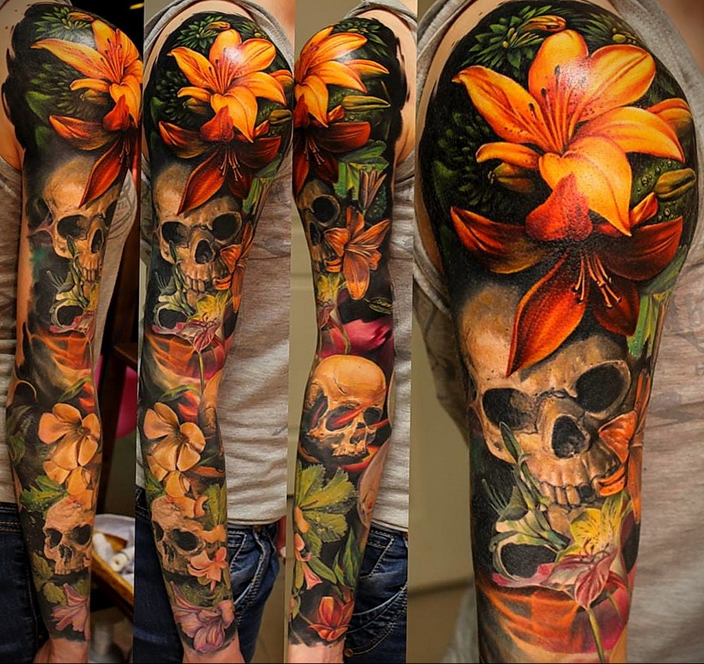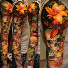 Çiçekler, insanların ve hayvanların kafatasları ile tamamlanır. Siyah mürekkebin bolluğu ile karakterize edilen gerçekçi bir manşon tekniğinin veya siyah iş stilinin bir parçası olabilirler.
