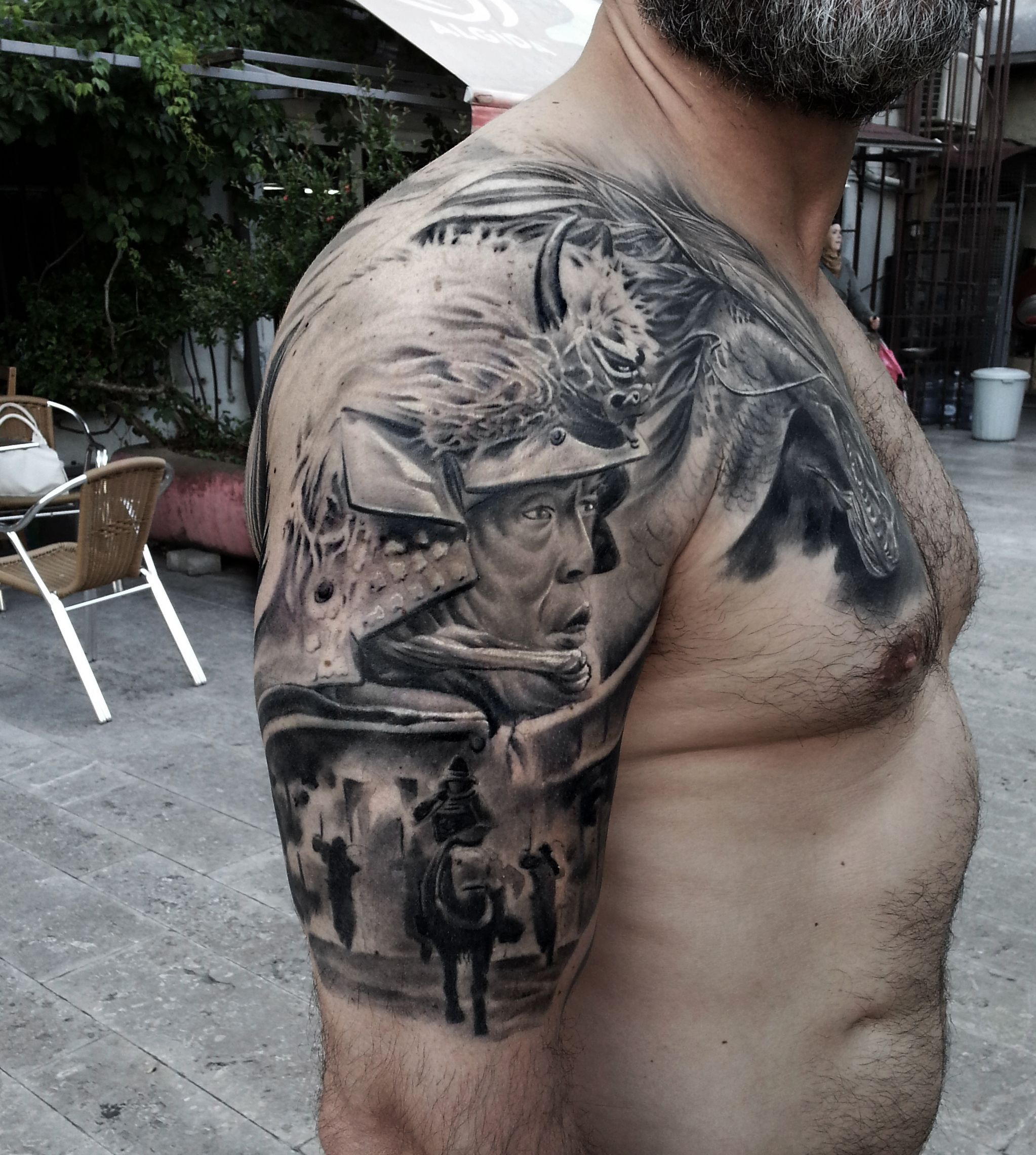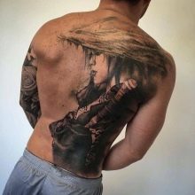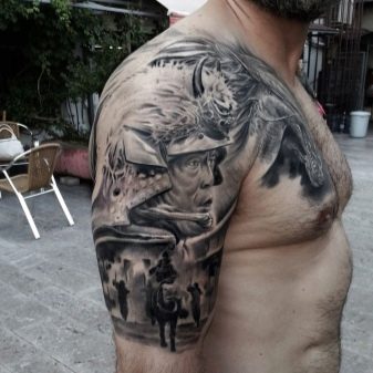 Samurayın erkek vücudunda muhteşem görünüyorlar. Dövme salonlarının ustaları, yalnızca kıyafetlerinin tasarım öğelerini değil, aynı zamanda karakteristik sakinliği ve üzüntüsü ile yüz ifadesini de doğru bir şekilde aktarır.