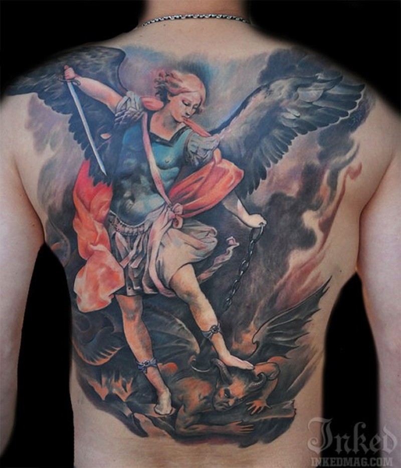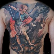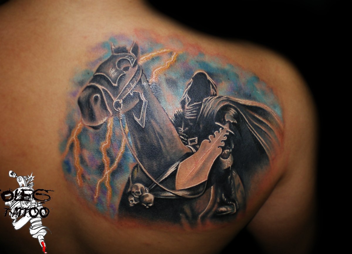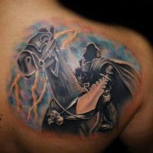 İlginç bir seçenek, birinin hayatı için at üzerinde dört nala koşan, kılıçlı bir ölüm meleği şeklinde bir dövmedir. Ek olarak, melek ağlayarak, dua ederek, yüzü açık veya başlıklı bir pelerin içinde tasvir edilebilir.