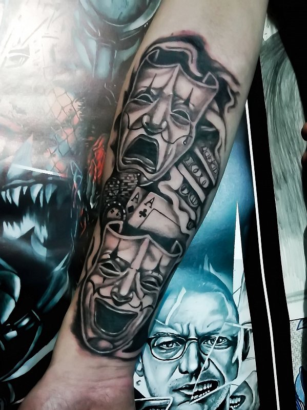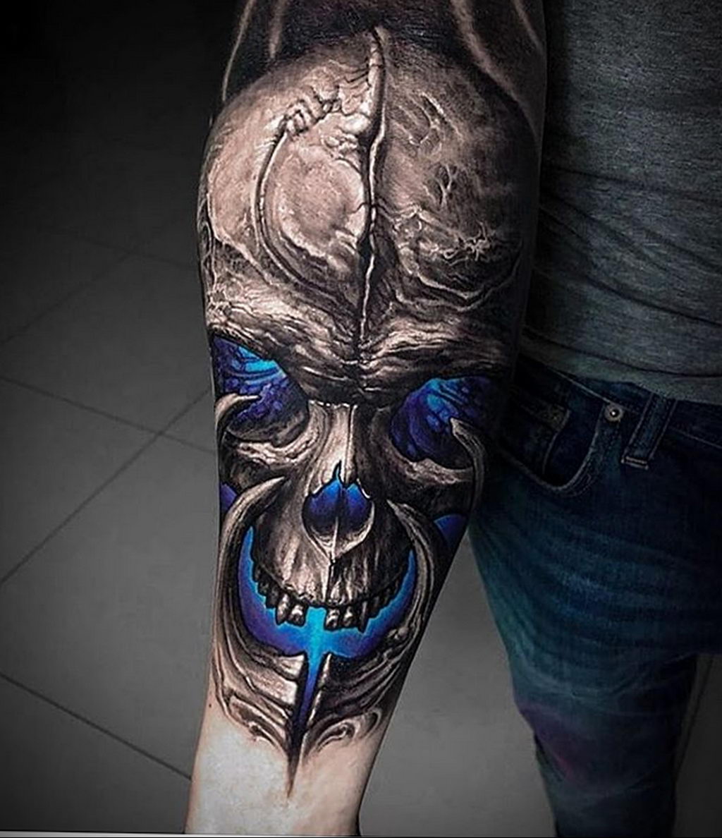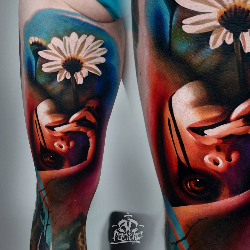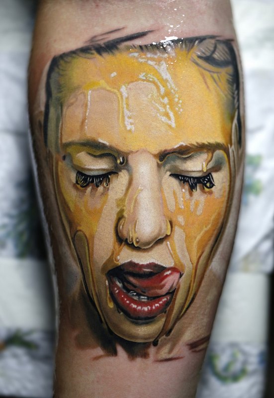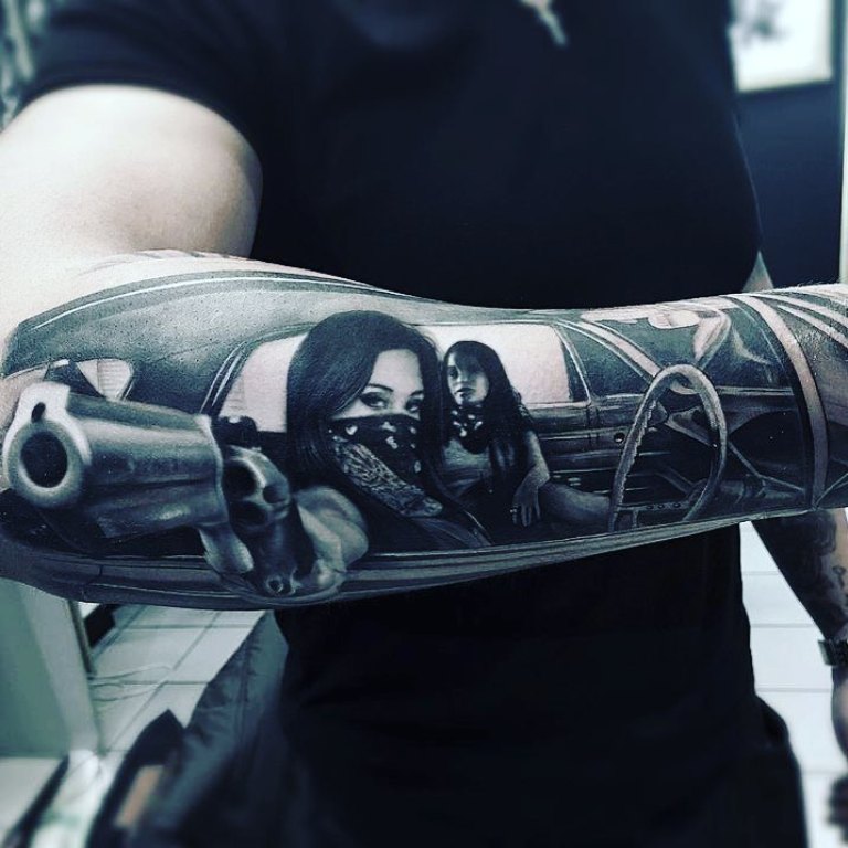 Bazen çizimin detayları para, mermer heykeller, fotoğraf filmleri, kalkanlar, kılıçlar, hançerlerdir. Sanatçı gerçekçilik ve biyomekaniğin bir karışımını kullandığında, dövmeyi çeşitli robotik unsurlar süslüyor.