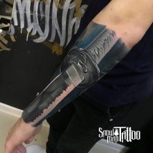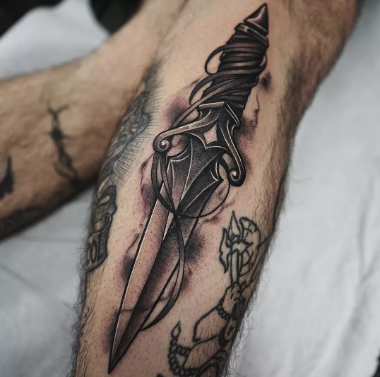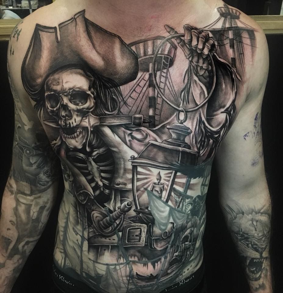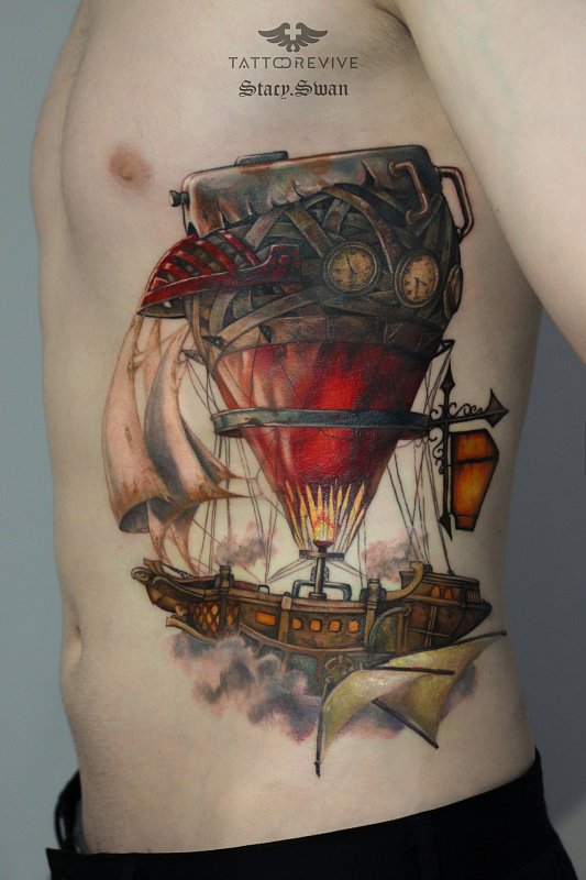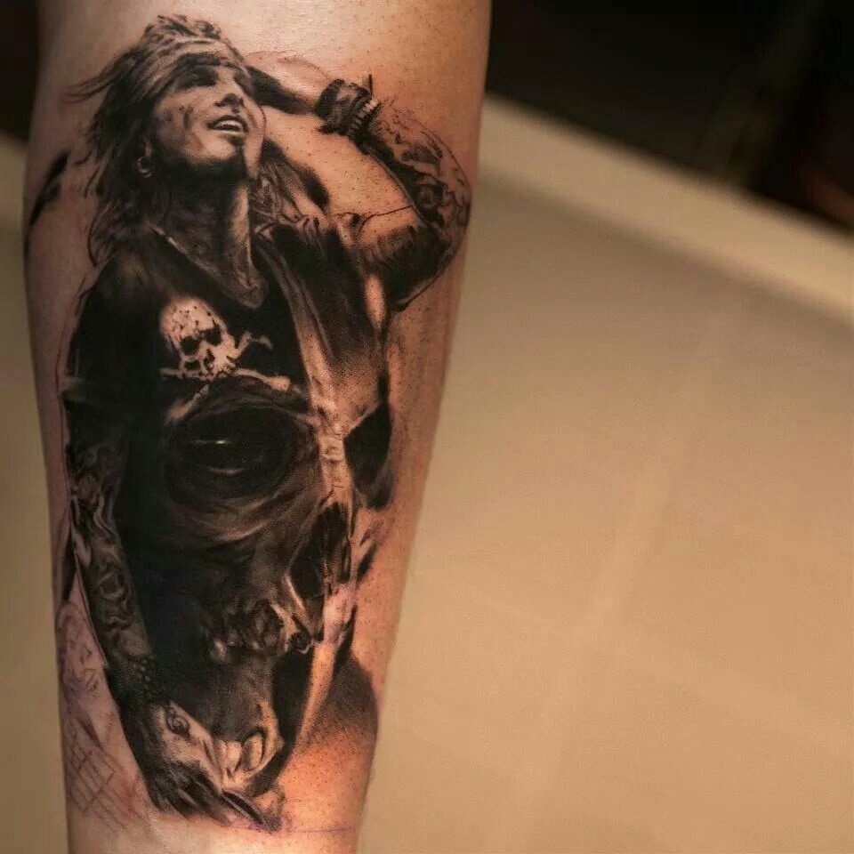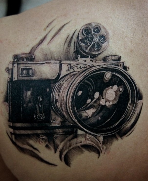 Bazen çizimin detayları para, mermer heykeller, fotoğraf filmleri, kalkanlar, kılıçlar, hançerlerdir. Sanatçı gerçekçilik ve biyomekaniğin bir karışımını kullandığında, dövmeyi çeşitli robotik unsurlar süslüyor.
