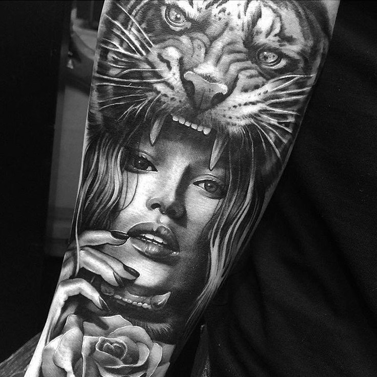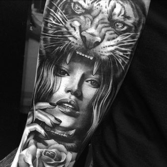 Başında bir gül ve bir kaplan olan bir kızın popüler bir görüntüsü. Canavar, karakterin zorlu karakterini belirler, gül kırılganlığı gösterir. Aslan genellikle bir saatle tasvir edilir ve bugün bir görüntüyü diğerine bindirmek, şeffaflık etkisi yaratmak modadır.