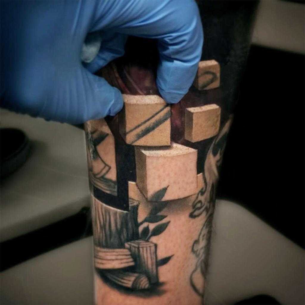 Çeşitli figürlerle gerçekçi yanılsamalar yaratma tekniği talep görmektedir. Örneğin, üst üste konan üç boyutlu küpler vücutta alışılmadık görünüyor.