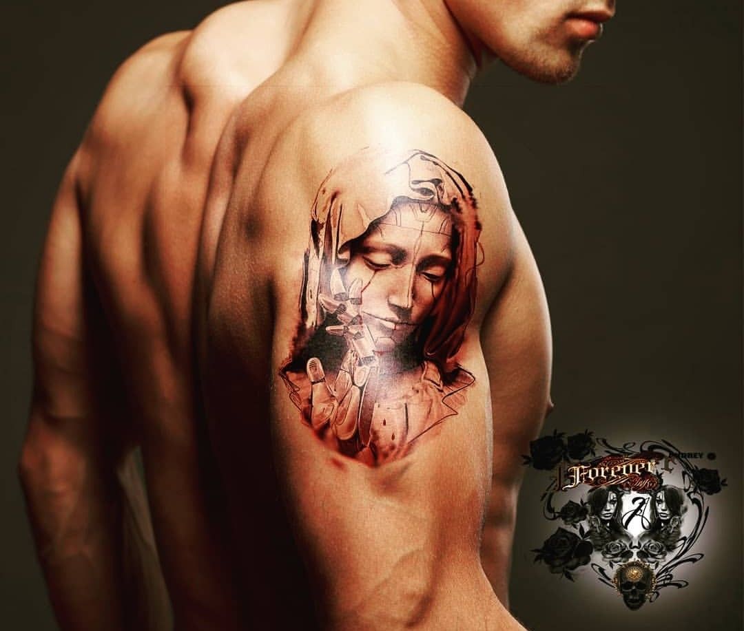 Manga karakterlerinin görüntüleri, kısmi makro portreler (örneğin, büyük gözler) erkek vücudunda harika görünüyor. Olağandışı seçenekler, Hint kabilelerinin liderlerinin veya tarihi şahsiyetlerin portreleridir.