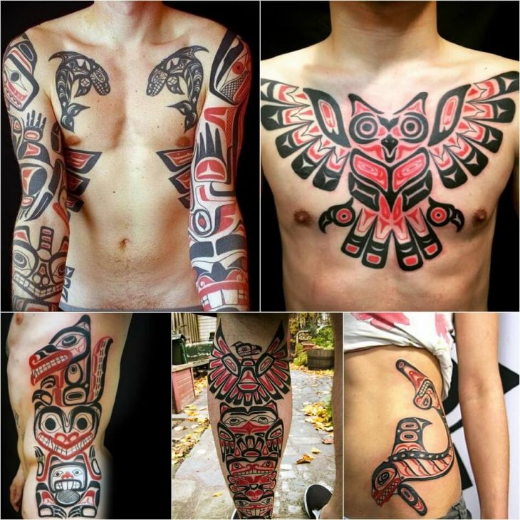 - Yerli Haida Kızılderili kabileleriyle ilişkili Kızılderili vücut resimleri... Tipik olarak, bu tür dövme iki tonlu bir renk şemasında gerçekleştirilir. Siyah, bir kabile için klasik renk olarak kabul edilir. Dövmenin rengi çok önemlidir. Yani, Haida kabilesinin dövmeleri için siyah, dünyayı kişileştirir. Mavi gökyüzünün sembolü, yeşil bitki örtüsünü ve kırmızı kanın rengidir. Fauna temsilcilerinin görüntüleri, Hint dövmeleri için sık sık konu haline geliyor. Haida için bu tür resimler muskaydı. Ve şu anda, seçilen tarzda dekore edilmiş dövmeler, sıkıntılardan koruyan bir muska görevi görebilir.