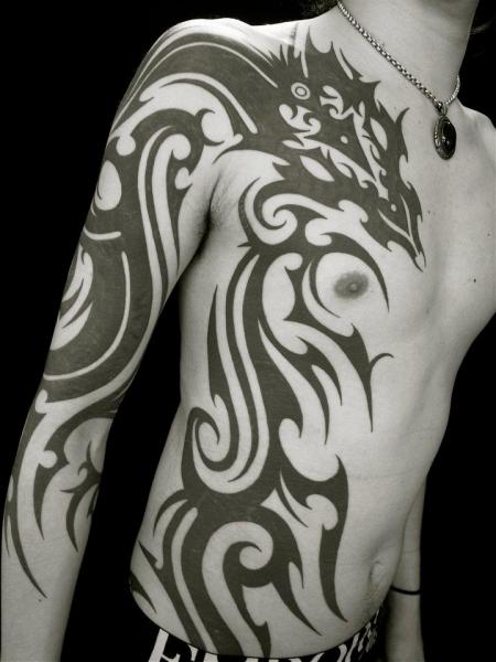 Genellikle boyuna ve hatta yüze bir kabile dövmesi uygulanabilir. Çoğu zaman, bu seçenek, yalnızca fikirlerinin doğru olduğuna inanan ve normal kanonlardan kökten farklı olabilen insanlar tarafından seçilir.