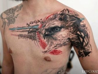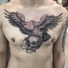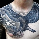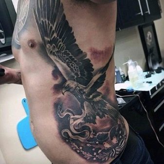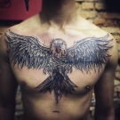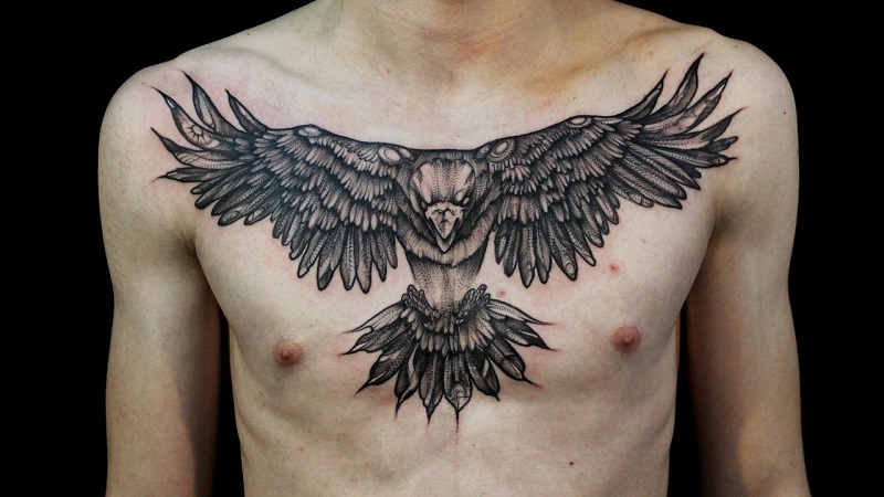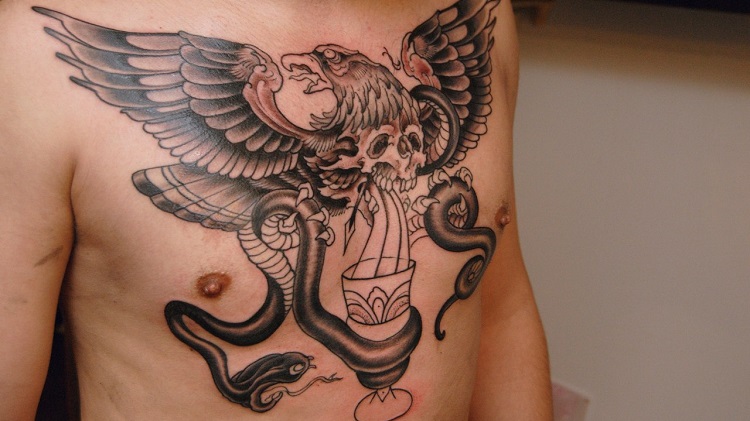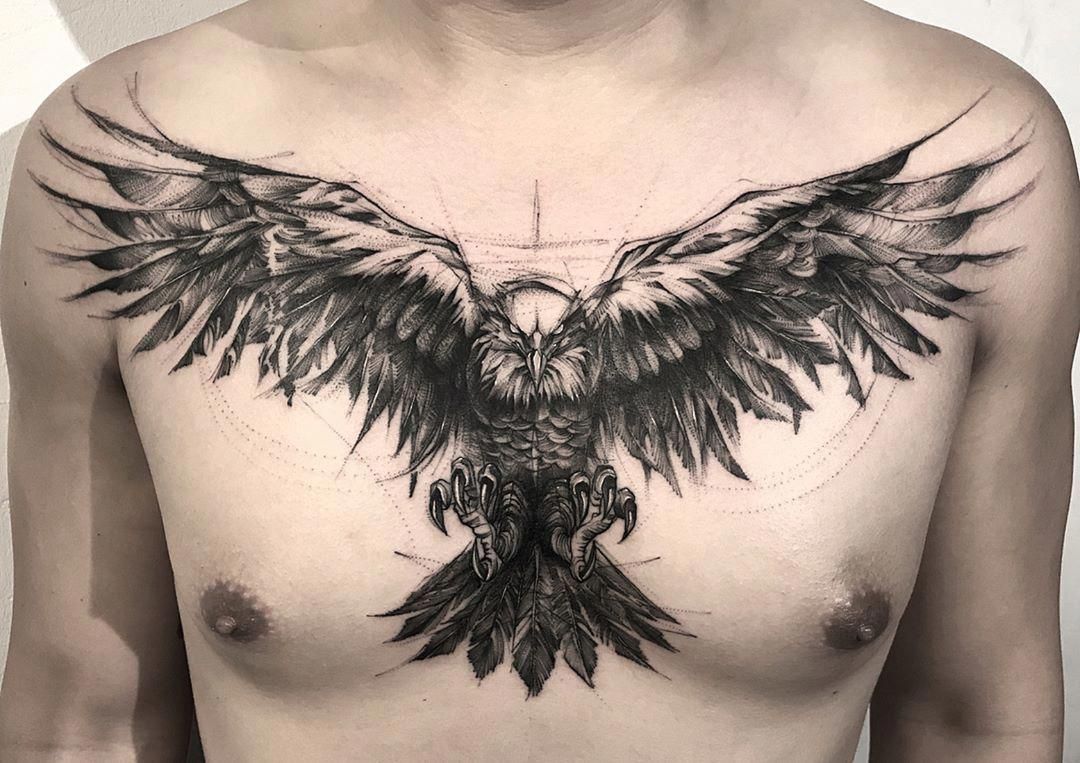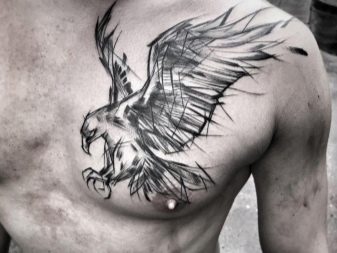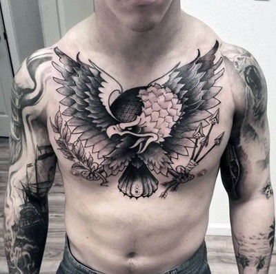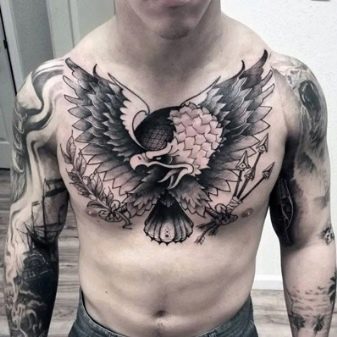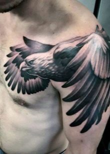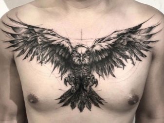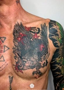 Göğüs kemiğindeki görüntü, beklemeye alışkın olmayan, ancak harekete geçmeye hazır hırslı erkekler tarafından seçilir. Sağ taraftaki resim, sol taraftaki karakter özelliklerini sembolize eder - hayattaki hayal kırıklığını gösterir. Göğüsteki kartal görüntüsü simetrik ve asimetriktir. İlk seçenek stilize, thrash ve grafik çizimler için, ikincisi - oryantal ve gerçekçi olanlar için uygundur.
