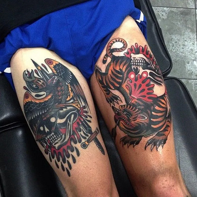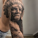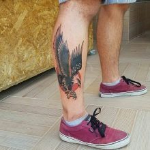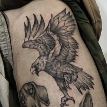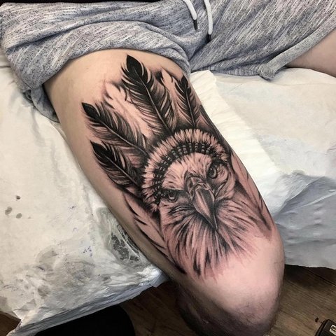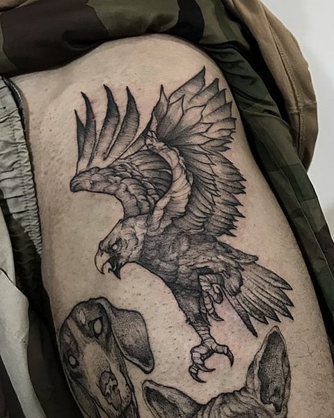 Uyluk, gururlu bir kuş için nadir bir yer olarak kabul edilir.... Bir bacağına doldurulmuş bir kartal, güçlü baskı altında bile yok edilemez canlılık ve istikrar anlamına gelir. Bacaktaki dövmelerin çizimleri farklıdır. Kuş, bir dalda otururken, dağların ve ormanın üzerinde yükselen olarak tasvir edilebilir.
