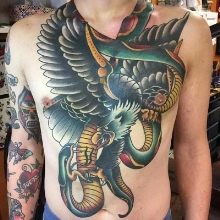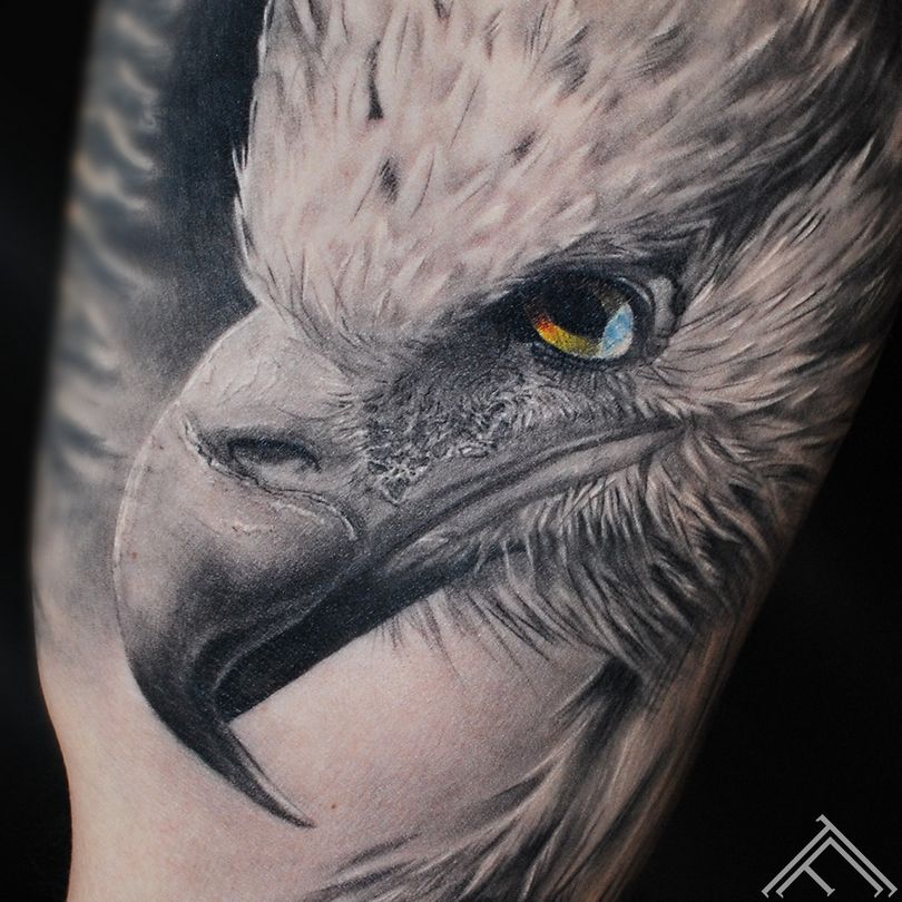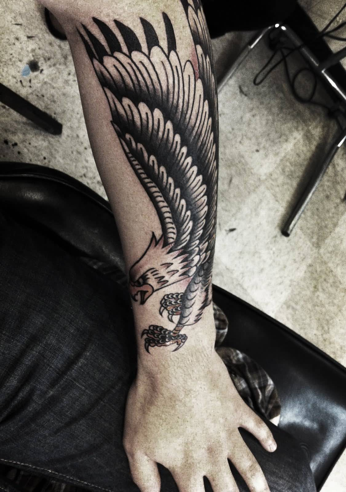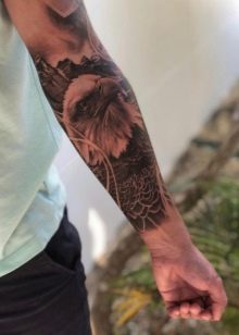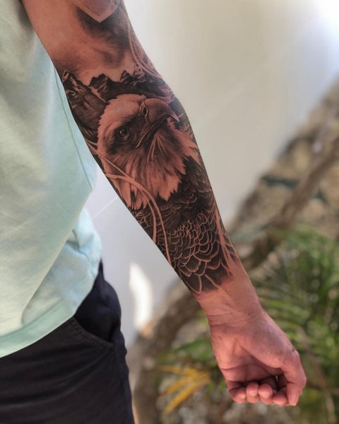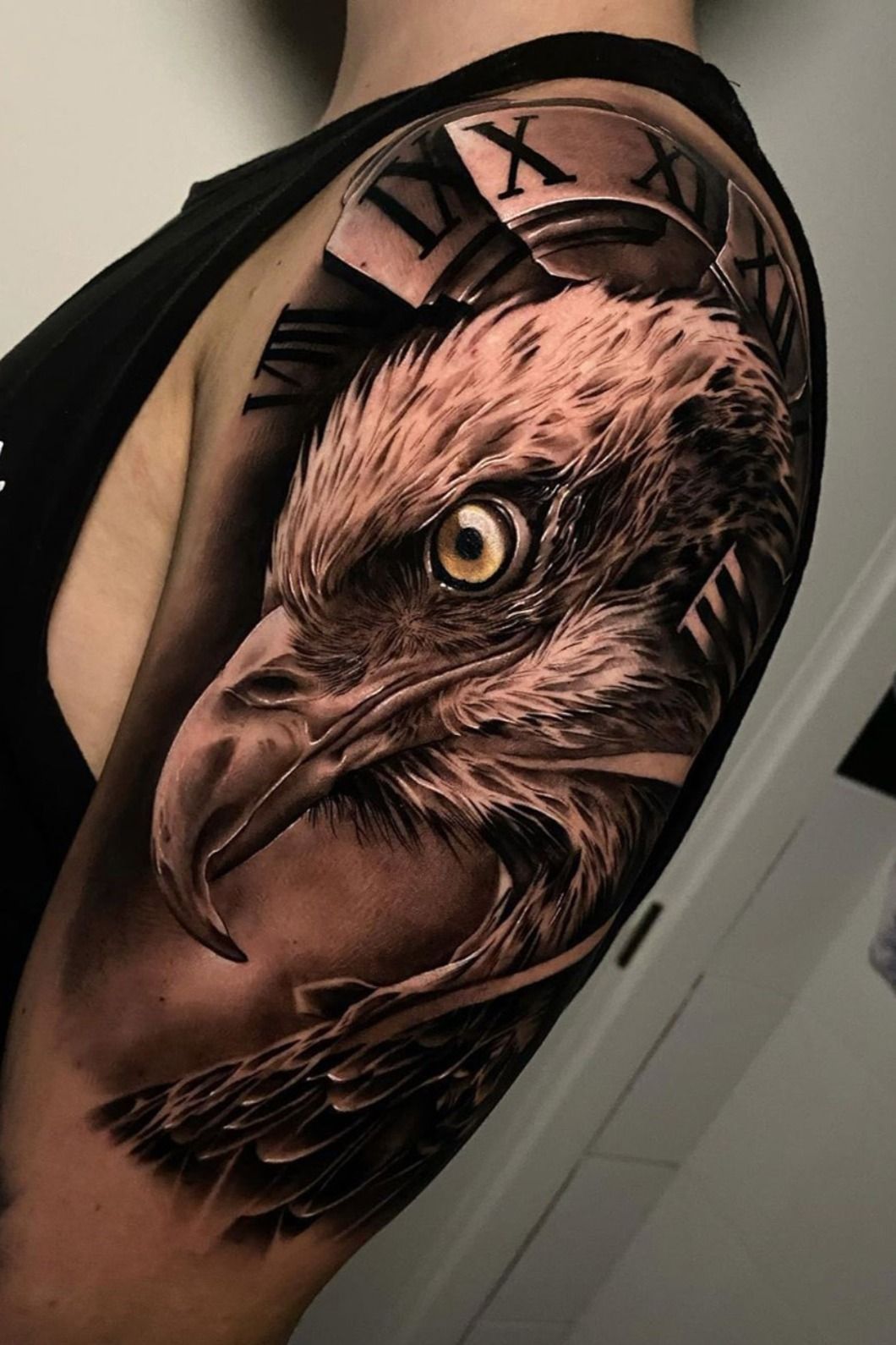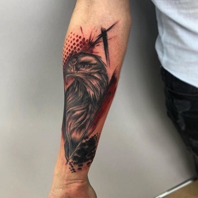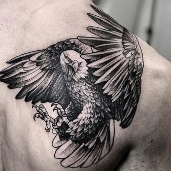 Omuza yerleştirme, erkekliği ve hayattaki herhangi bir sıkıntıya hazır olduğunu gösterir. Ön kolu kaplayan bir dövme, ilkelere bağlılıktan ve yaşamda sağlam bir konumdan bahseder. İki bölgede kartallar gerçekçilik, grafik, eskiz, geometri tekniklerinde mükemmel görünüyor. Kompozisyonun doğru seçimi ve vücudun anatomik özellikleri dikkate alınarak hareket etkisi yaratmak mümkündür. Harika bir fikir, ayrıntılı işlemeye sahip makroskopik bir kuş bakışıdır. Göğüs kemiğine ve boyuna hareket eden dövmeler de muhteşem görünecek.
