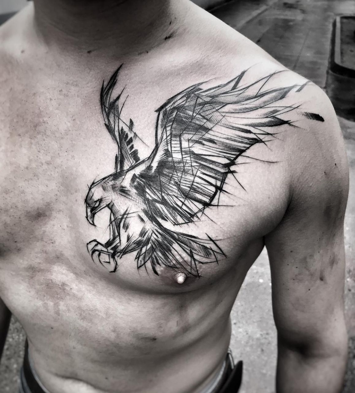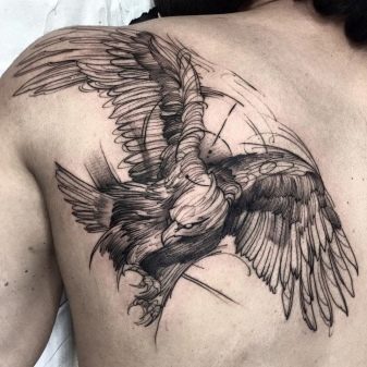 Yeni yönlerden biri eskiz stili. Eskiz, siyah boya ile cilde dövülür ve yüksek hızlı bir karakalem etkisi yaratır. Görünen ihmale rağmen, her ayrıntı doğrulandı. Genel konsept vuruşlarla belirtilir, gölgeler ve hacim farklı yönlerde çizgilerle verilir. Eskiz stili kartal, gizli bir anlamı olan önemli bir figür ve arka plandır.