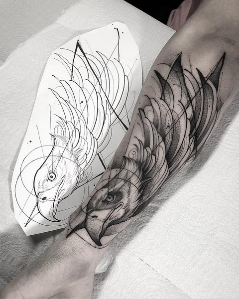 Çoğu zaman, kanatlı bir kartal çizimi geniş formatta yapılır. Küçük görüntüler, dövmenin tüm güzelliğini aktarmaz. Bazen yumruklara ve ellere uygulanırlar. Dövmeler portre, makroskobik ve konu olabilir. Ayrıca düz, üç boyutlu, üç boyutlu, düzenli, karikatürize, stilize, grafik olabilirler. Çizimler için fikirler değişir. Popüler seçenekler, avına saldıran saldıran bir kuş olan yükselen veya dalış yapan bir kartaldır. Adamlar, başı yana dönük kuş gibi. Modaya uygun bir arsa - hareket halinde bir kartal, avını yakalamak için pençeleri serbest bırakır. Standart olmayan bir fikir - Hint motiflerinin kullanımıyla portre tekniğinde çizim.