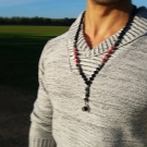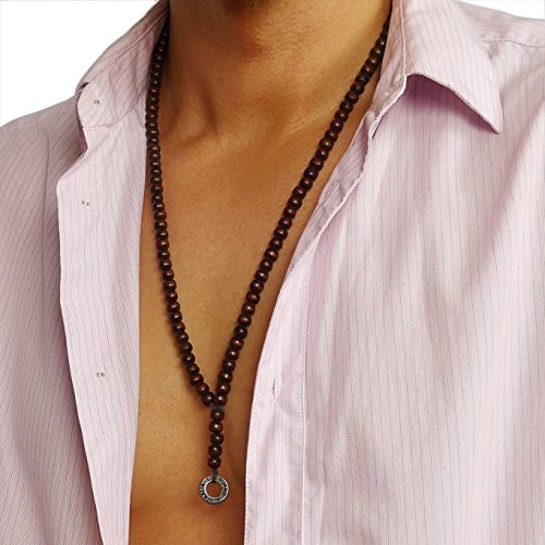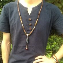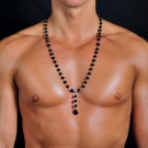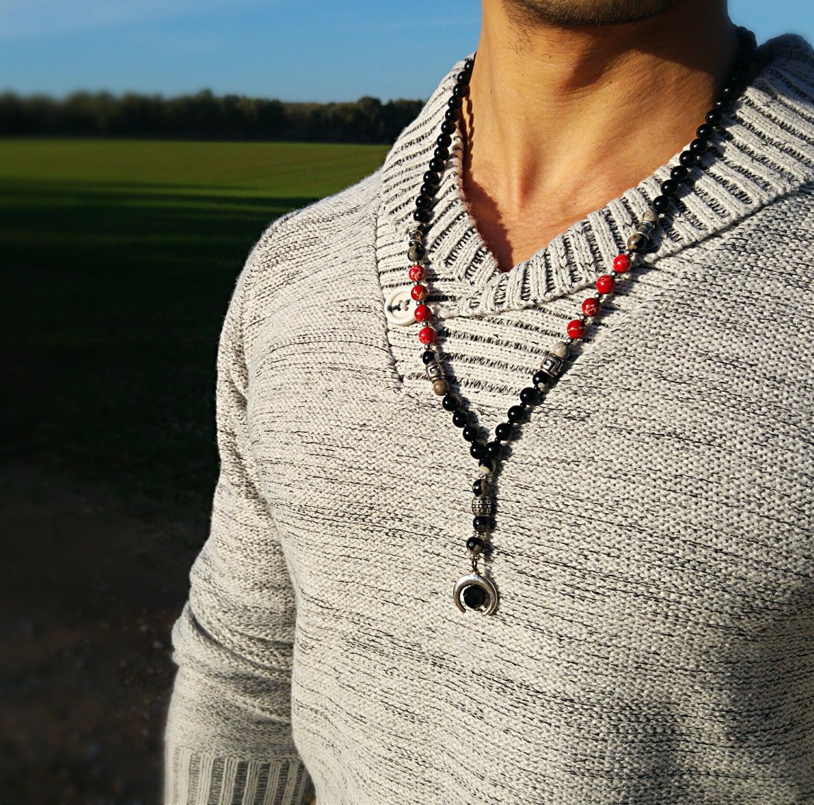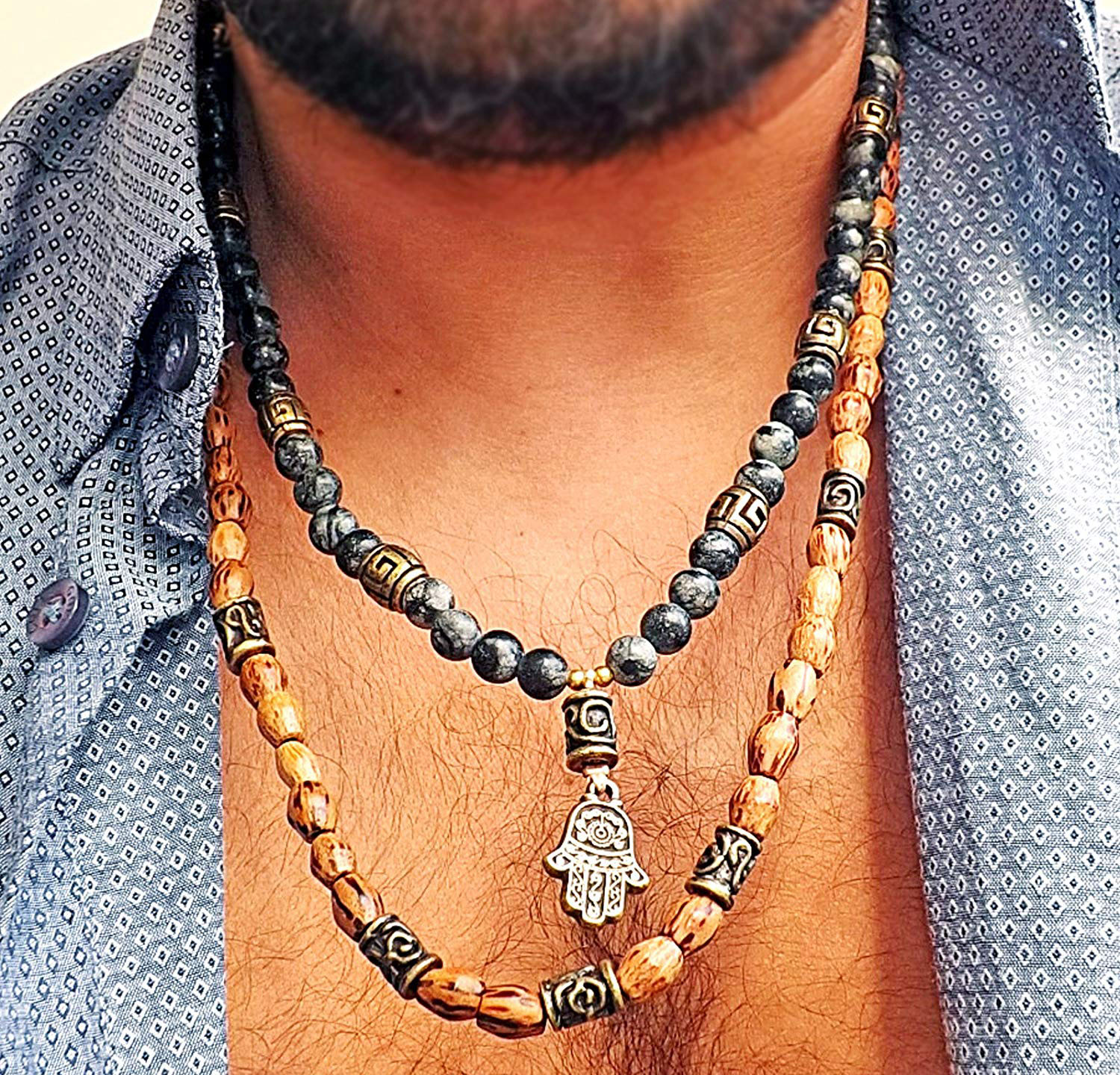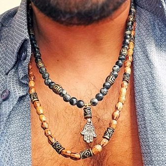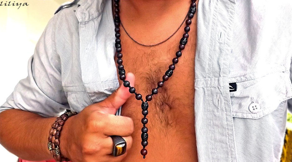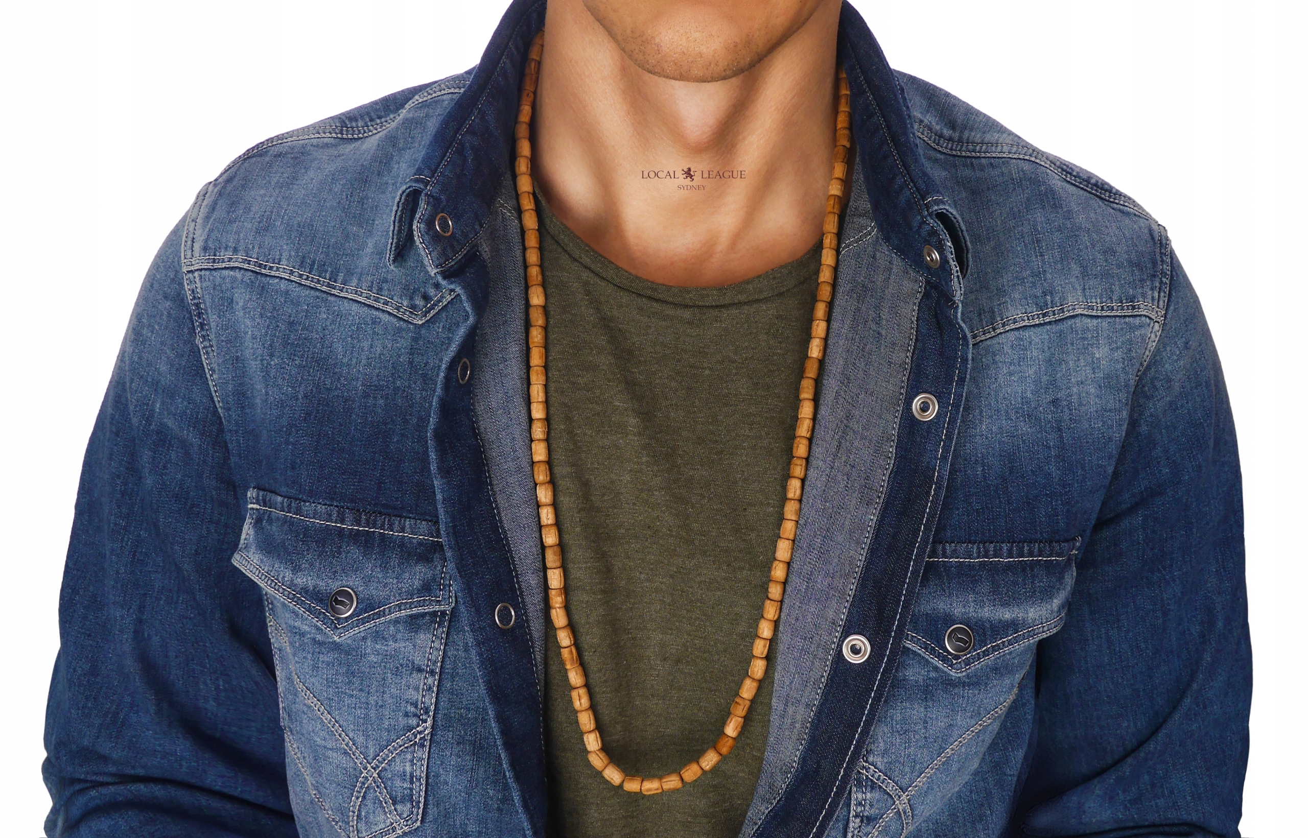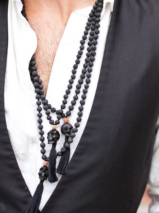 Les longues perles pour hommes en pierre naturelle ou en bois ont fière allure avec des chemises déboutonnées qui révèlent le torse.
