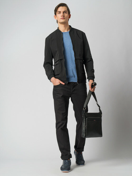 Un pantalon classique d'un bleu foncé riche est en harmonie avec un pull à col roulé bleu clair. Les chaussures en cuir verni noir sont associées à un coupe-vent allongé avec une fermeture éclair cachée. Le résultat est une image commerciale harmonieuse.