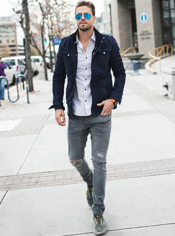 Dans ce cas, il était possible de combiner les classiques et la vie quotidienne en une seule image. Un jean déchiré gris vieilli est complété par une chemise blanche classique. Le coupe-vent bleu marine ressemble à une veste en raison de sa coupe similaire. Des baskets asphalte et des lunettes aviateur tendance avec verres miroir complètent le look.