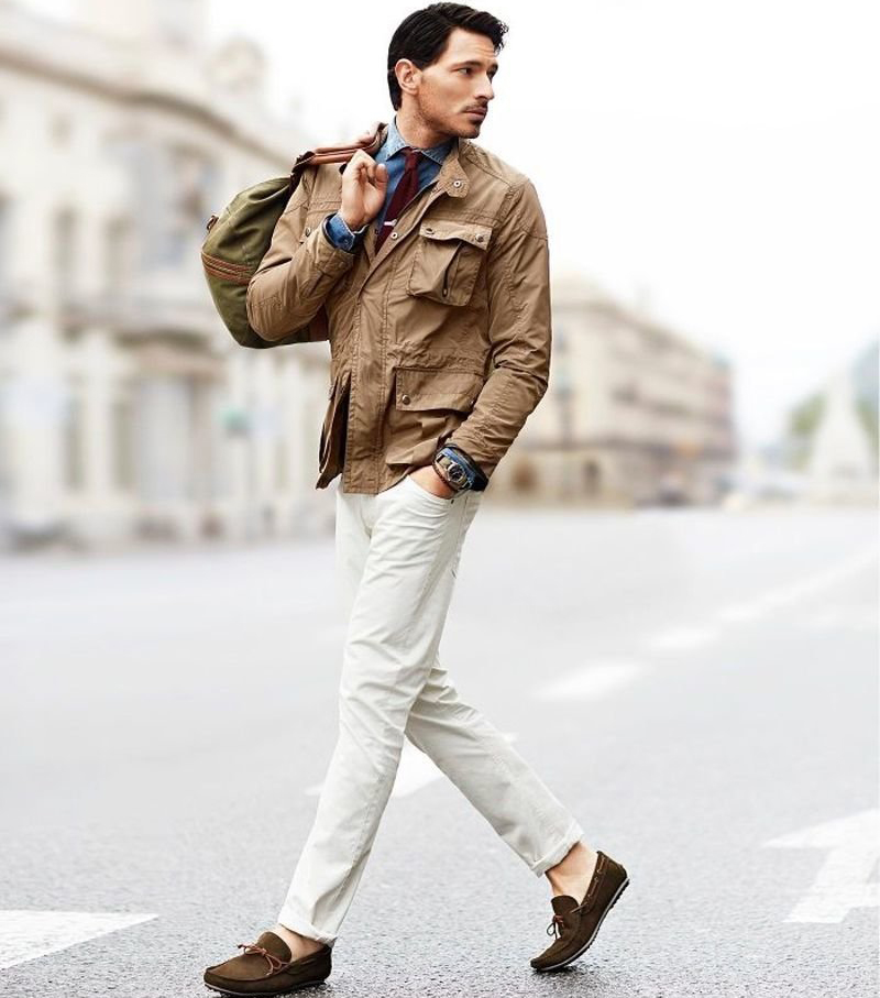 Une excellente option pour le début de l'automne. Les pantalons légers sont le point culminant principal autour duquel toute l'image est construite. La chemise bleue est complétée par une cravate terracotta qui fait écho aux mocassins marron matelassés. Un coupe-vent en chocolat au lait complète parfaitement le look en lissant légèrement les nuances sombres.